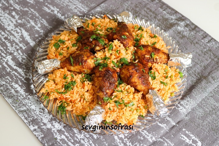 Gebackenes Hähnchenkeule mit Gemüsereis
